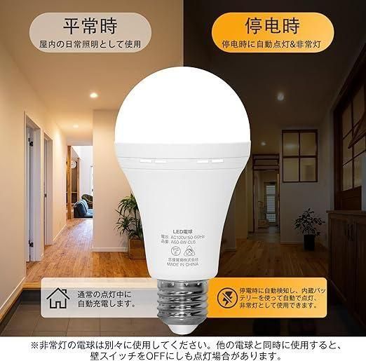 【停電したらすぐに点灯!】led 防災電球は2400mAHの蓄電式の大容量バッテリー内蔵で、地震や悪天候などの予期しない停電の際に、自動で検知し、素早くパッと点灯 ! 非常灯として使用できます。停電の暗闇に伴う不安や、危険から解放し、家族の安全を守ります。壁スイッチがONの状態で停電時に自動検知し、 LED非常灯には連続点灯約5時間以上可能で、高輝度点灯約3時間あとは低輝度点灯約2時間(低輝度の明るさは常夜灯のような明るさです)。【ご注意:停電時(壁のスイッチがONの状態)、電球を非常灯として使用ことができます。】