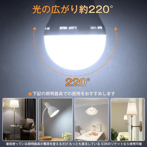 【点灯時に自動充電】 E26口金なので、一般的な照明器具に取り付けられて、光の広がり約220°になります。普段使用しているLED電球、点灯している間に自動充電します。ランタン ledとしては、災害時には、そのまま防災グッズに!外して懐中電灯代わりに!【ご注意:電池交換はできません。非常灯の電球は別々に使用してください。他の電球と同時に使用すると、壁スイッチをOFFにしも点灯場合があります。】